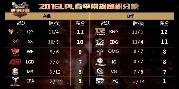 LPL春季常规赛分组积分榜(截止4月8日)