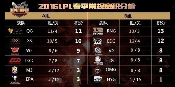 在4月9日的比赛结束后,2016《英雄联盟》职业联赛(简称:LPL)春季赛常规赛B组的赛事全部结束,季后赛的出线队伍也全部确定。IG虽然拿出瑞兹+希维尔的新体系,但还是没能战胜老辣的RNG,最终以小组第四出线,RNG则确保了头名的位置;VG在首局前期大逆风的情况下稳住局势横扫HYG,绝地翻盘以小组第三的身份冲进季后赛,而OMG则在不敌EDG后因为净胜场次小分较低而落到第五,成为了季后赛的遗珠之憾。