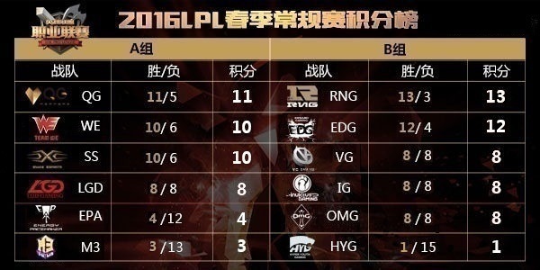 4月10日,2016《英雄联盟》职业联赛(简称:LPL)春季赛常规赛的最后一个比赛日拉开战幕,WE在关键时刻偷掉大龙战胜QG,但仍无法阻挡QG以小组第一的排名挺进季后赛;LGD战胜SS,达成七连胜的同时,也保持了第二轮同组对抗的全胜记录;LPL的收官战由EPA对阵M3,最终EPA凭借更胜一筹的节奏轻松碾压M3,本场比赛结束后,LPL春季赛常规赛的比赛也宣告全部结束。