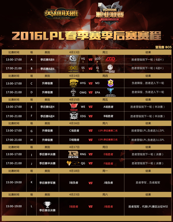 根据赛制,2016LPL春季赛季后赛/升降级赛将全部采用BO5(即:五局三胜)赛制。