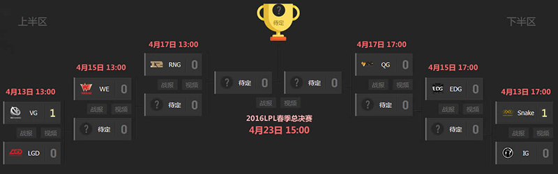 4月13日,2016《英雄联盟》职业联赛(简称:LPL)春季赛季后赛阶段将迎来第一个比赛日,届时将进行两场(即:VG vs LGD、SS vs IG)季后赛8进6的比赛。2016LPL春季赛季后赛阶段正式开启,八支晋级队伍将对盘龙杯发起最后冲击。八强争霸,谁能脱颖而出夺得2016LPL春季赛最高荣誉,《英雄联盟》将与广大玩家共同关注。