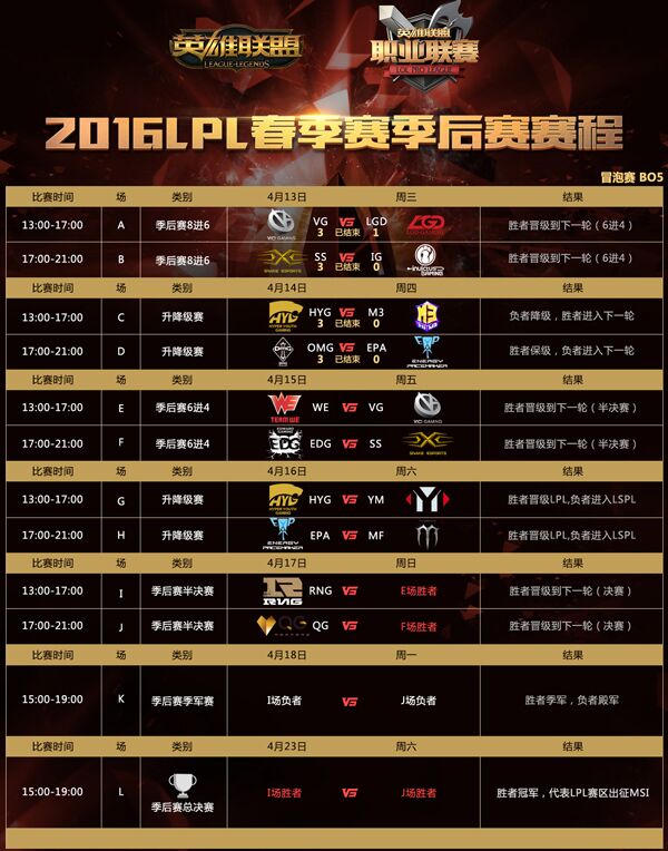 2016LPL春季季后赛赛程图(截止至4月14日)