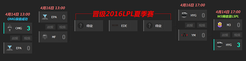 4月14日,2016《英雄联盟》职业联赛(简称:LPL)升降级赛正式拉开战幕。在决定去留的生死关头,赛季表现不佳的HYG采用了非常成功的英雄池针对战术战胜M3的同时,也保住了留在LPL的可能,M3则在输掉比赛后不得不面临降级到LSPL的命运;另一边,在S1mlz和Quan的轮流carry下,OMG轻取EPA,确定将保级LPL。