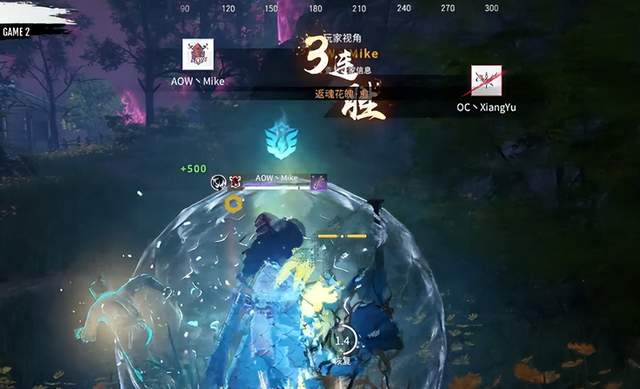 第二场比赛开局落地架Mike就收获了两个击败数,然后在三族大议所周边,Mike将OC、Xiangyu打残之后,紧追不放,一个精准振刀成功将OC、Xiangyu带走。有意思的是,香香接到追击恰好是Mike,此时Mike已经是四个击败数成为本场战神荣誉,香香面对Mike被打出残血,被迫开大还是遭Mike击杀。
