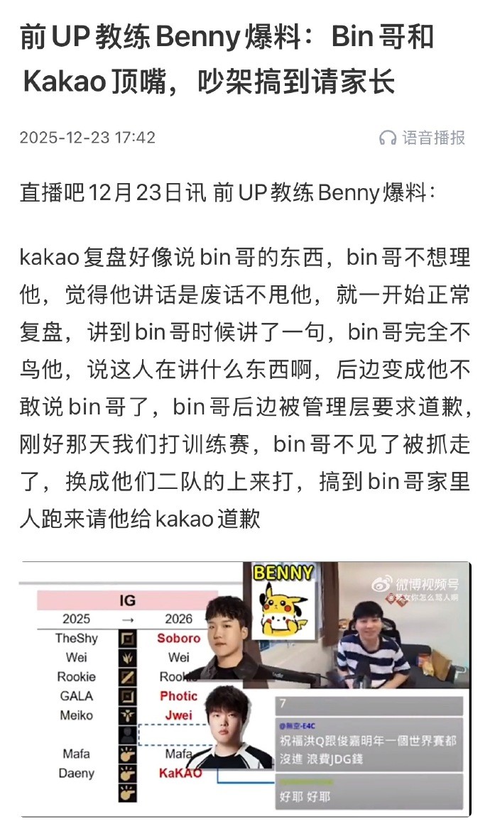 在此之前,曾担任UP教练的Benny在去年年底就爆料过类似的事件,当时他声称Bin因为和Kakao在复盘的问题上发生了不愉快,Bin甚至和当时教练组成员的Kakao顶嘴。事后甚至是Bin家里人过来让他给Kakao道歉,这件事才终于得到了解决。如今Bin又疑似与BLG的领队有了矛盾,只是不知道这次问题能否得到解决。