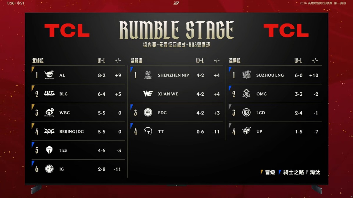 随着BLG与AL的二番战结束,也意味着LPL第一赛段组内赛阶段的比拼就此落下帷幕。经历为期四周的激烈角逐,LPL十四支队伍就排名就此确定,登峰组前四的队伍直接获得晋级季后赛的名额,涅槃组后两位会被直接淘汰,剩下的八支队伍都需要进入“骑士之路”阶段,去争夺剩下四张季后赛的门票。