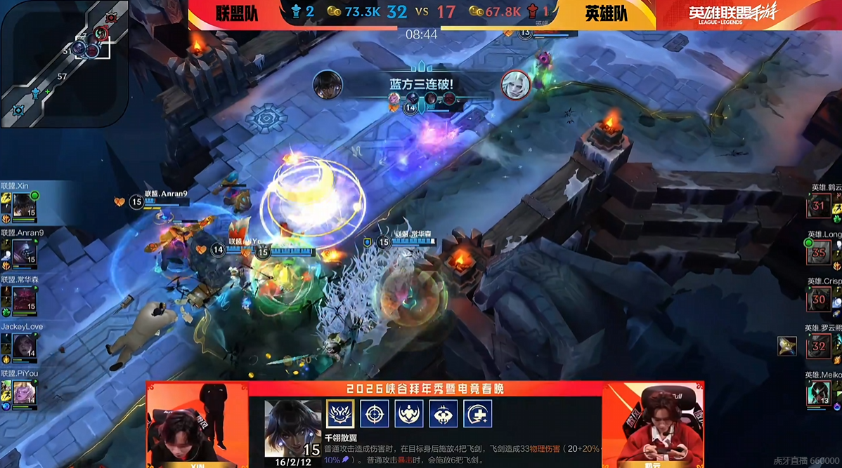随后,在骆歆的引导下,两支战队的成员逐一亮相。罗云熙领衔的"英雄队"阵容豪华:iG.Meiko、Crisp两位LPL冠军辅助坐镇,搭配WRL明星选手Long与人气主播鹤云;而常华森率领的"联盟队"同样星光熠熠:TES.JackeyLove这位世界冠军AD压阵,辅以TT.Xin、KBG.Anran9两位手游悍将,再加上创作者痞幼。而对于更新过后的大乱斗,他们也都发表了自己的看法。可以感受得到,他们已经跃跃欲试了。