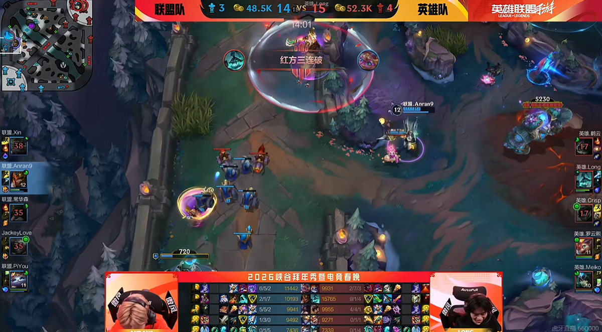 诺拉作为新英雄刚上线,强度自然不用多说。开局没多久,TT.Xin便完成了两次“单杀”。不过,英雄队也不甘示弱,在Long的出色表现下,英雄队稳住了节奏。而在此后的比赛中,双方你来我往,联盟队这边凭借着诺拉稳住局面,而英雄队Long的人马则是成为联盟队最头疼的存在。Long出色的表现以及他拿出人马这样的英雄,也是让官方解说纷纷表示,真不愧是马年的本命英雄。