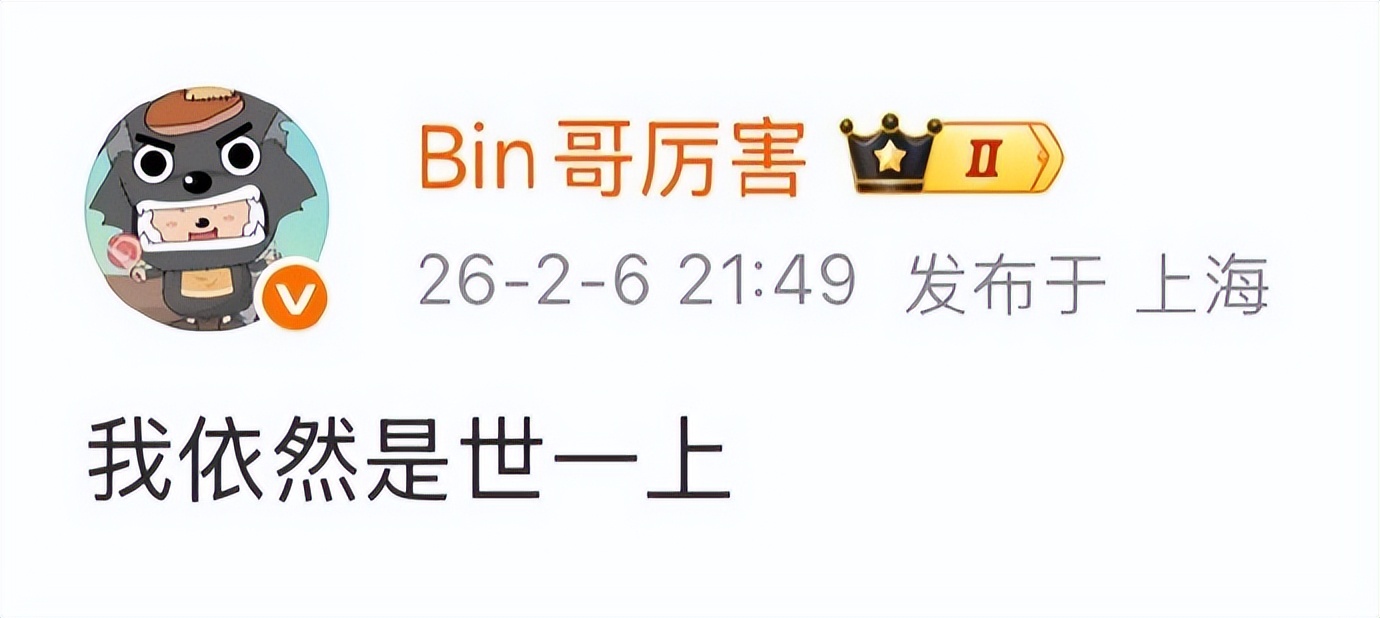 就在刚刚被AL翻盘没多久的情况下,Bin再次体现了自己性格中固执、不服输的一面,在赛后他发微博直言不讳道:“我依然是世一上。”可想而知,这条微博一发很快有网友质疑Bin哥是不是疯了,以往他虽然也会有出乎常人意料的惊人之举,但是也不会采取输了之后还这样“嘴硬”的方式去博眼球。