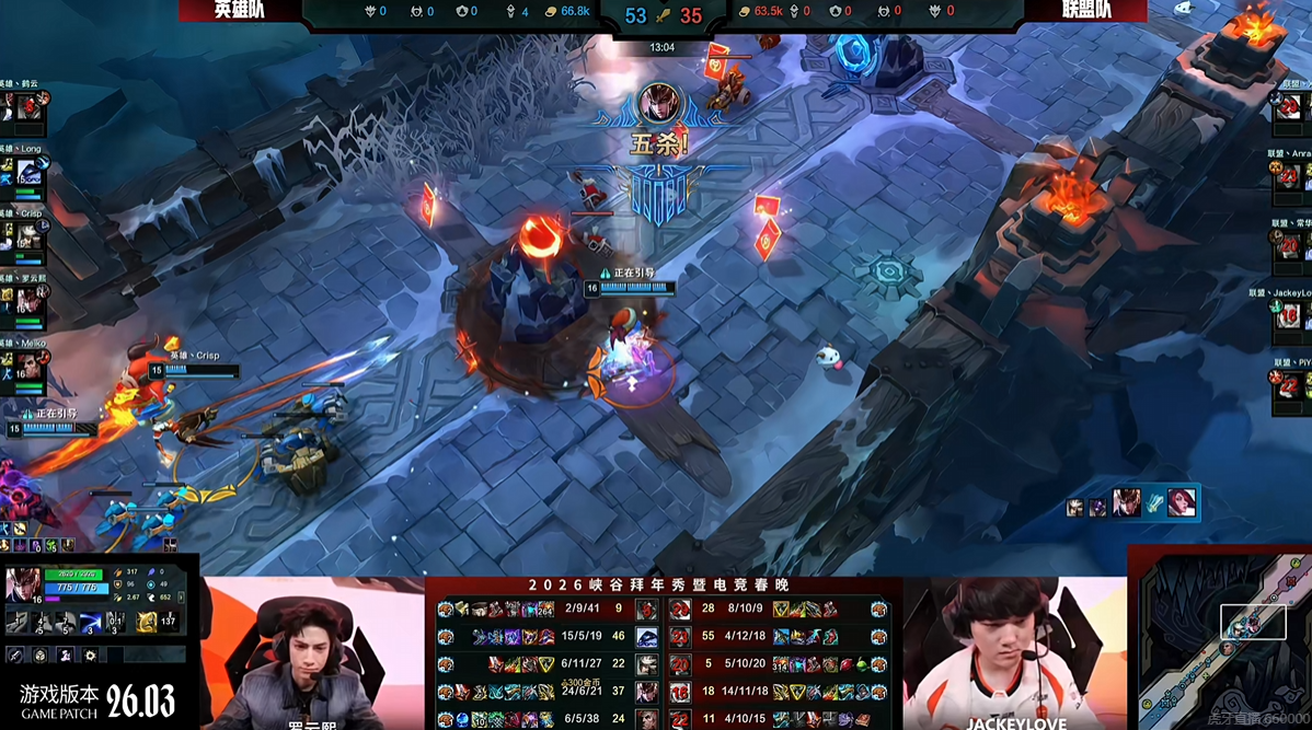 首局海克斯大乱斗,罗云熙在Crisp与Meiko两位冠军辅助的保驾护航下,操刀英雄Carry全场,斩获惊艳"五杀",英雄队先声夺人。
