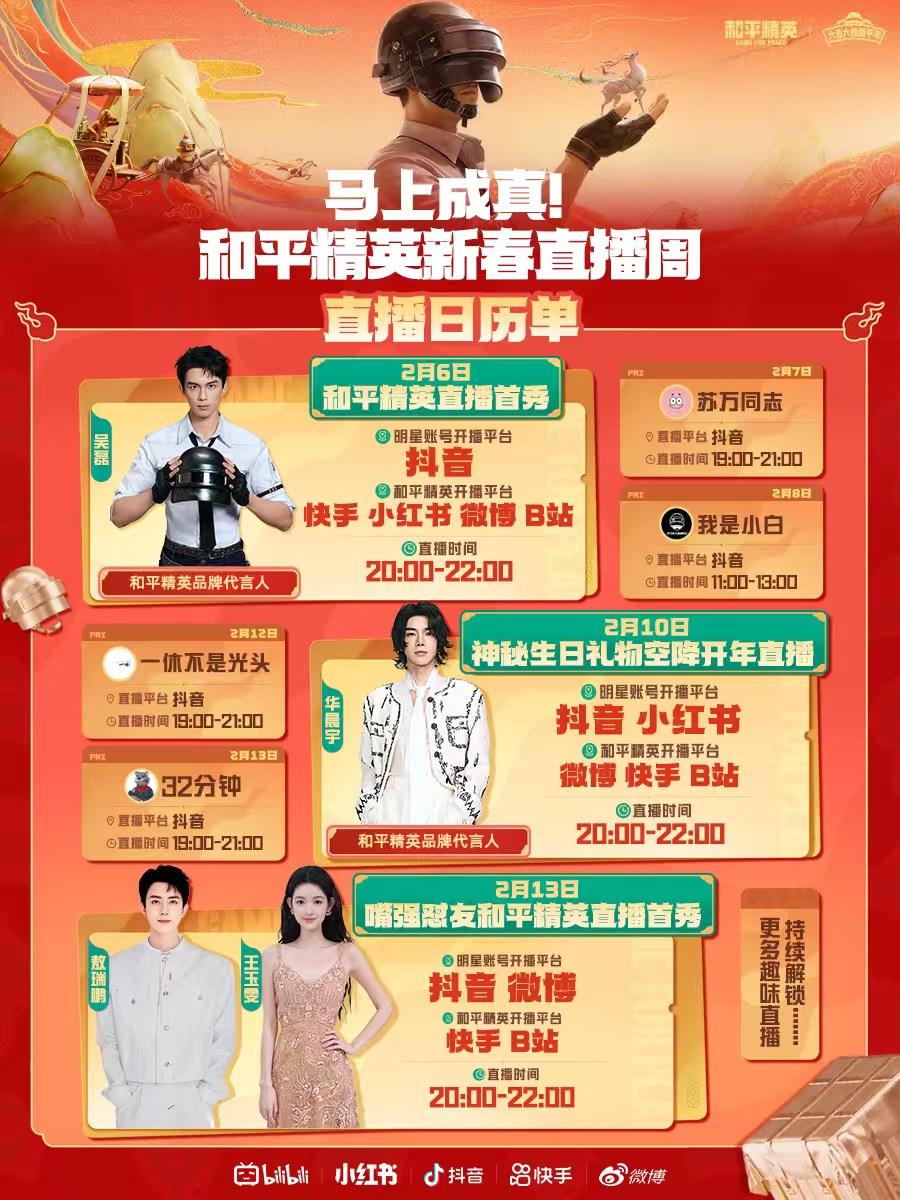 2月6日-2月13日,由多位明星达人阵容化身玩家的吃鸡人脉,组成《新春直播周》。本次直播不再是明星单方面露脸,而是实时公布房间号,明星和粉丝真正玩在一起,一起组队跑毒、攻楼、冲刺决赛圈。这还不够,他们还会回应玩家发在弹幕里的游戏愿望,玩家可以决定明星是苟到决赛圈还是现场刚枪。业内都在琢磨怎么把明星直播玩出新花样,《和平精英》这次直播给出了答案:让明星成为玩家的“吃鸡人脉”,游戏心愿,马上成真。