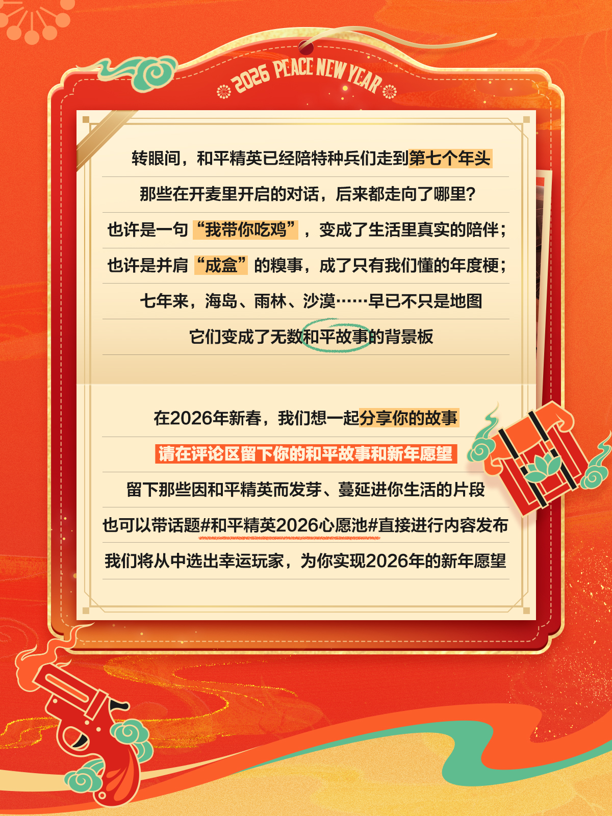 在宏大叙事之外,本次春节活动的精妙一笔,在于最终将话筒交给了玩家。在2026年新春,狂欢的最终落点并非仅是观看,而是邀请每一位玩家成为故事的讲述者与参与者。 通过#和平精英2026心愿池#征集活动,打造一个能承载真实情感、回应个体期待的游戏生态。春节营销已从短期的“事件运营”,升维为长期的“关系经营”。