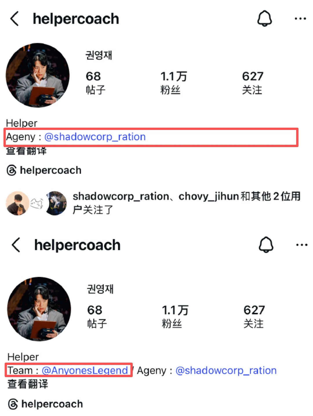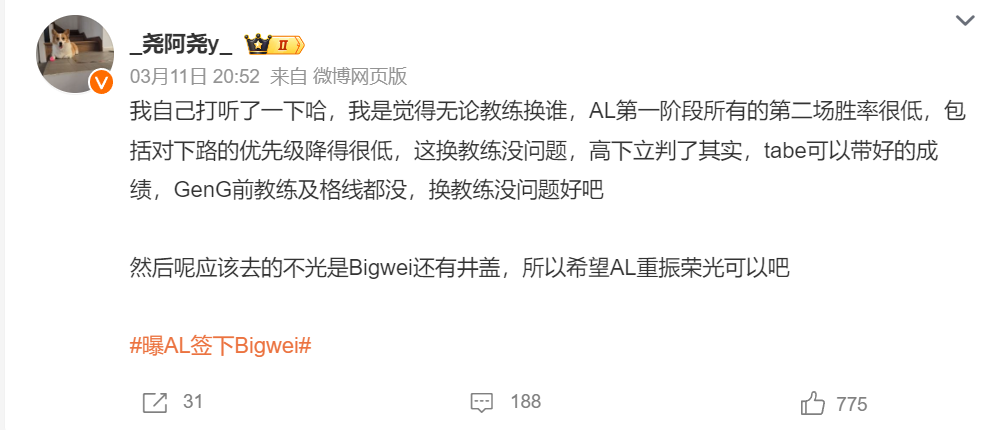 果不其然,今日有网友发现第一赛段AL的主教练Helper已经在社媒删除了个人简介里的“队伍:AL”这一前缀,这似乎坐实了坊间关于AL将更换教练的传言。不出意外,根据近期多位博主的爆料,Bigwei以及井盖或许会是第二赛段AL的新教练。
