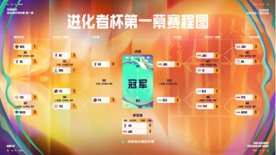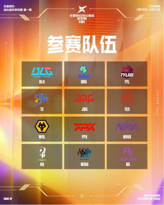 本次2026无畏契约进化者杯系列赛第一幕由9支未前往圣地亚哥大师赛的VCT CN联赛队伍(BLG、DRG、TYL、TE、JDG、TEC、WOL、FPX、NOVA)与2025年11月全国大赛专业赛道前3名队伍(AQ、WSIG、RA)共12支队伍参赛。根据2026启点赛赛果,BLG、DRG、TYL、TE四支队伍直接进入四分之一决赛阶段,其余队伍则出战首轮比赛。进化者杯系列赛第一幕除季军赛和决赛为BO5外,其余比赛均为BO3单败淘汰赛。此外,进化者积分还将作为2026年VCT CN联赛晋升赛参赛资格的主要依据。