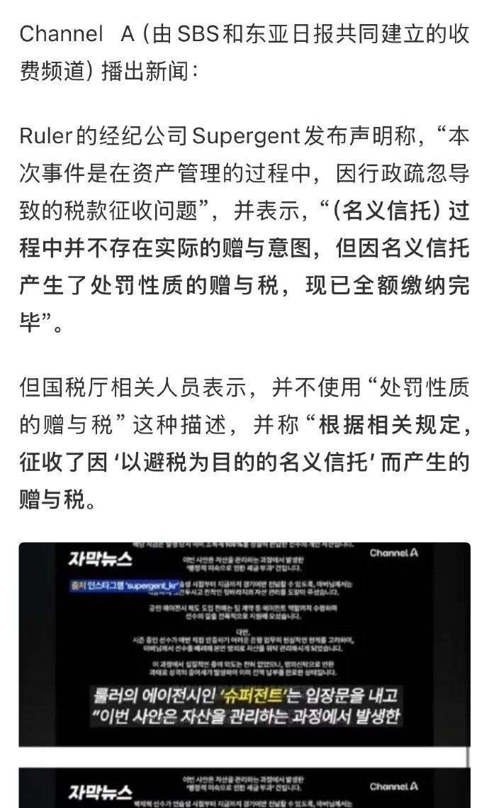 根据韩媒报道,韩国国税局相关人士反驳了Ruler经纪公司声明中所说的“罚款性质的赠与税”这一说法。对于以避税为目的的名义信托,适用赠与议程规定征收赠与税。除此之外,韩媒报道还提到Ruler以“劳务费”为由支付给父亲的款项,也被认为为“明显是为了逃税”,Ruler不服提出上诉也被驳回。