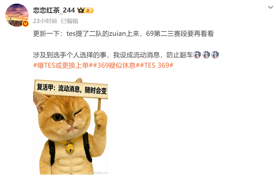 而在这场比赛结束后,电竞博主恋恋红茶更是爆料369萌生了休息的想法,俱乐部一边在找其他上单一边在努力劝他回心转意。然而最后似乎还是没有劝回来,TES只能启用备用方案提上了二队的上单选手Zuian,而369可能第二、第三赛段后续再考虑是否回归赛场。