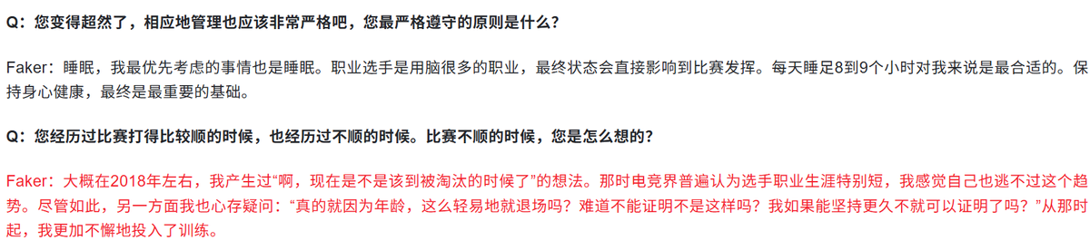 他在采访中直言不讳地表示:“那时电竞界普遍认为选手职业生涯特别短,我感觉自己也逃不过这个趋势。”好在最终Faker克服自我怀疑的心魔,在之后更坚持不懈地投入了训练,希望靠着自己能坚持更久来证明职业选手生涯特别短的观点是错误的。