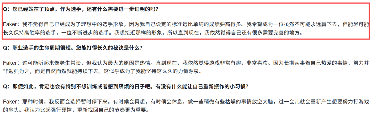 除此之外,Faker虽然已经是站在LOL顶点的传奇选手,但是他并不认为自己成为了自己理想中的选手形象,因为他自己设定的标准远比单纯的成绩要更高。借着回答这个问题,Faker也表示希望自己能成为长久保持高胜率并不断进步的选手,他希望自己能达到或接近那样的形象。