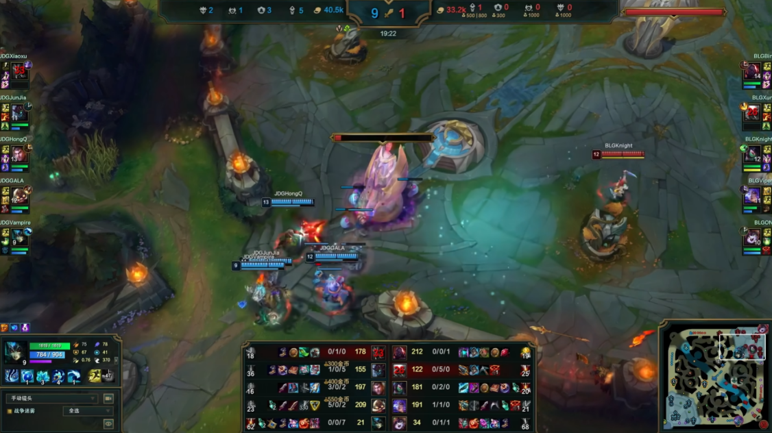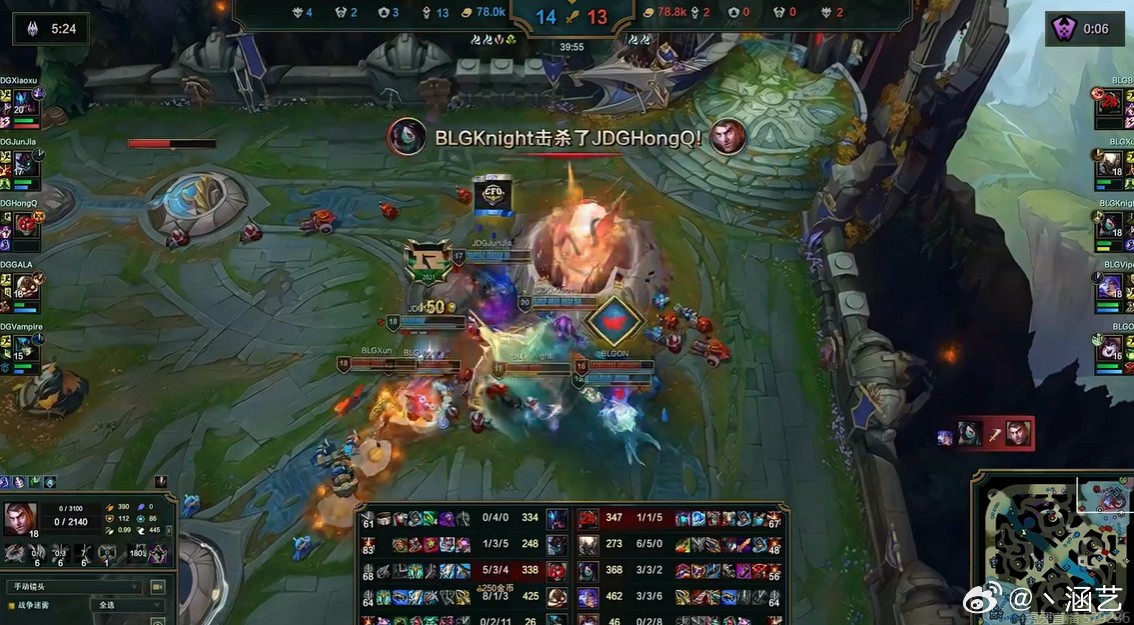 关键的第三局Bin哥塞恩对线Xiaoxu的挖掘机,依旧是轻松拿捏掌握上路线权,将对手打出了40分钟0-4-0的尴尬战绩,但是前期JDG积累的优势实在太大,直接4V6的情况下硬生生让Xiaoxu蹭了一把躺赢局,Bin哥塞恩只是死了一次直接BLG就基地爆炸。
