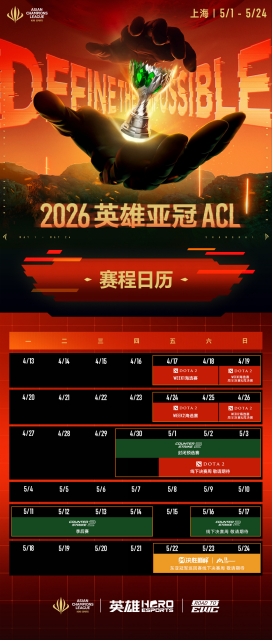 继首届赛事后,DOTA2将再次作为赛事项目加入2026英雄亚冠ACL 。本次比赛将采取“线上海选赛+线下淘汰赛”相结合的方式进行,海选赛阶段从4月17日开始,至4月26日结束,为期两周,届时每周将通过线上比赛决出2支队伍晋级线下淘汰赛。5月1日-5月3日,海选赛晋级的4支队伍将与4 支直邀中国顶级战队XG、YB、VG、Refuser同台竞技,冠军将独揽 9 万美元奖金并锁定 EWC 参赛席位。