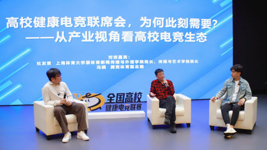 第一场对谈以“高校健康电竞联席会,为何此刻需要?——从产业视角看高校电竞生态”为主题,邀请上海体育大学原体育新闻传播与外语学院院长、传媒与艺术学院院长杜友君与腾竞体育副总裁冯骁展开交流,聚焦高校电竞发展的现实痛点与联席机制的产业价值。嘉宾们一致认为,当前高校电竞的发展有两个主要矛盾,一是社会认知与产业生态的偏差,二是高校培养与产业需求的错位。围绕这些问题,二人提出应以联席机制为桥梁,以校企合作为抓手,在课程共建、实践共育、标准共研等方面形成合力,把“健康电竞”理念真正落到育人全过程、贯通产业全链条。对谈中还提到,“育人”应成为高校电竞发展的核心命题之一,学生们应该在理性参与电竞的同时提升综合素养、职业能力与责任意识,推动高校电竞从兴趣参与走向能力培养、从活动组织走向人才培养。