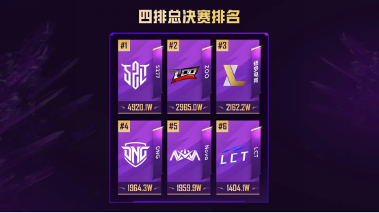 冠军队伍5277在小组赛与半决赛均以B组第一昂首晋级,总决赛首场虽打掉修罗电竞两人,但也不幸遭ZOO阻击,仅剩选手“抖鹏”带着102万撤离。第三场中,他们抓住DNG与LCT交战两败俱伤的时刻精准劝架,仅用一个淘汰便吞下六人物资,一举登顶榜首。此后5277利用淘汰信息播报,屡屡完成战场收割,第四场收益便已突破3350万,最终以4920万总收益锁定冠军,领先第二名近两千万,凭绝对断层优势捧杯。