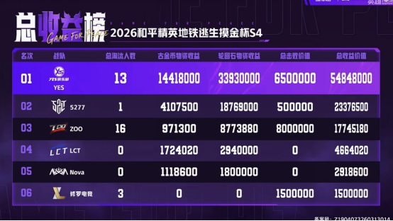 本届S4赛季的一大亮点,当属全新加入了“古墓迷途”表演赛。比赛中,YES战队以近乎碾压的姿态成为全场焦点。首场他们便展露锋芒,“我是小白”收获麒麟血脉手套后,借助五雷符一穿二LCT战队,并配合队友成功阻止LCT剩余选手的撤离,单场以7个淘汰与3325万收益强势登顶。次局与修罗电竞的墓中交锋更显统治力——YES以0换4灭队修罗电竞,即便后期与ZOO的榜首争夺战也毫不手软。关键时刻,麒麟血脉手套屡次在残血时触发回血效果,让YES队员完成反打、扭转战局,将对手的压制意图悉数化解。最终,YES以两场总收益超5484万的成绩断层领先,以近乎两倍于对手的收益差距锁定胜局。