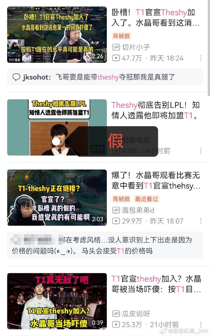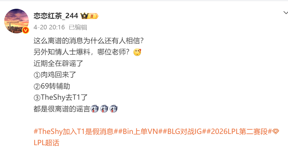 而随着这则离谱的传言逐渐发酵在圈内引发热议,知名电竞博主恋恋红茶也在微博上发文辟谣,表示The Shy去T1是非常离谱的谣言,并且他还疑惑道:“这么离谱的消息为什么还有人相信?”除此之外,Rookie归队以及369转辅助这两个近期电竞圈热度比较高的传言,同样也被澄清是谣言。